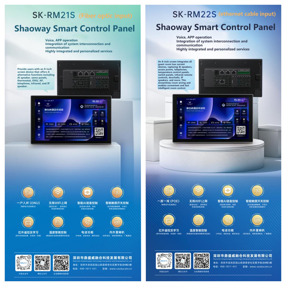 During the event, General Manager Mr. Han also highlighted Dingshengwei's recently launched Shaoway Smart Control Panel. The design of this new product, from its appearance to its functions, reflects careful consideration of actual needs: aesthetically, its simple and elegant design seamlessly blends into various hotel decoration styles without disrupting the spatial harmony with obtrusive equipment; functionally, it achieves detailed integration—combining commonly used features such as AI speakers, ONU, AP, telephones, air conditioning control panels, switch panels, infrared remote controls, and speakers into a single device. This eliminates the need to deploy multiple devices in guest rooms, saving installation space and reducing the complexity of subsequent maintenance.