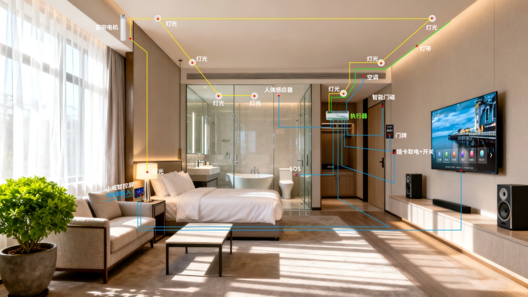 This system is highly scalable, connecting to small gateways and the internet. It implements a full stack of capabilities, including mini-programs, AI voice control, automatic unlocking, facial recognition, and remote upgrades, covering everything from basic lighting control to comprehensive scenario-based services. Installation and commissioning are simplified, allowing even ordinary electricians to complete the installation. Multiple rooms can be covered in a single day, significantly improving construction efficiency. Daily maintenance is also performed by on-site electricians, reducing the need for non-professional personnel and minimizing the impact of room occupancy.